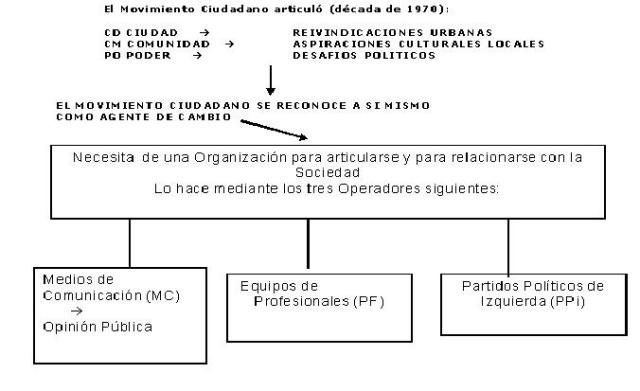 Aciertos de los movimientos ciudadanos en estos años fue el reconocerse como parte de un movimiento más global, movimiento social ciudadano; el saber construir una buena relación, incluso “articulación”, de estos movimientos con equipos técnicos profesionales, partidos de izquierda y con los medios de comunicación, articulación no siempre fácil. Algo semejante a lo ocurrido, como veremos, con los movimientos alterglobalizadores, contra la guerra de Irak y con los movimientos de indignados. Utilizando la terminología de Manuel Castells (1986) podemos resumir sus características en el siguiente cuadro:
