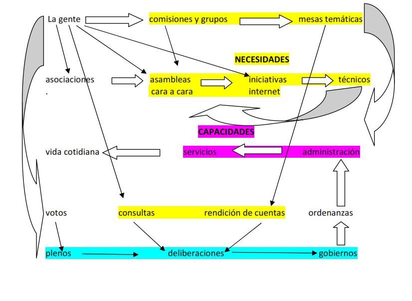 En Latinoamérica y en Europa hemos participado y estamos desarrollando Planificación y Presupuestos Participativos, con algunos dobles circuitos de toma de decisiones que se retroalimentan entre sí. Después de 25 años de experiencias, la Declaración de Bogotá da testimonio de estos principios participativos, para poder pasar desde una democracia solo representativa hacia una participativa. El siguiente esquema presenta unos circuitos paralelos y articulados con las formas de administración que conocemos. Si bien se restringe bastante el papel del gobierno electo, no deja de existir. Se trata de razonar qué otros cauces deberían intervenir para que la gente se pueda sentir protagonista de la toma de las decisiones que le afecten a su vida personal y comunitaria.